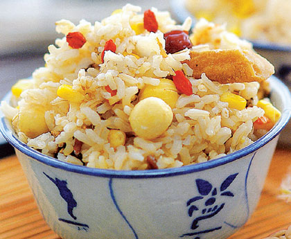 3. 将荷叶汁烧滚后投入红、绿豆,继续煎煮半个小时后,下米(若水太少可另外加水),大火煮滚后,改用小火焖至饭熟(也可采用电子砂煲)