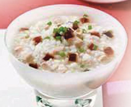 2. 将粳米、姜丝放入锅内,倒进药汁。再加入清水900g,大火煮滚后如常法,熬成稀粥。