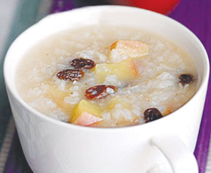 配料:梗米100g、鲜山药60g或干山药15g、苹果1粒、莲子15g、芡实15g、山楂10g、白术6g、炒麦芽10g、红枣5枚、红糖15g。